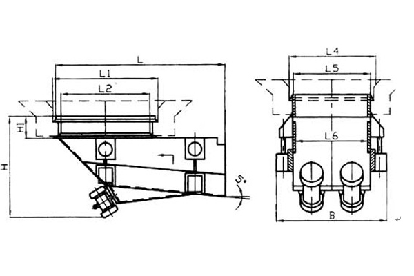 該機(jī)型結(jié)構(gòu)緊湊,工作噪音小,安裝方便,且無需改動(dòng)即可更換原有的K型往復(fù)式給煤機(jī)。該機(jī)結(jié)構(gòu)分固定部分和振動(dòng)部分兩部分,固定部分和煤倉(cāng)剛性聯(lián)接,振動(dòng)部分通過減振器和固定部分聯(lián)接,安裝時(shí)不需要在煤倉(cāng)上做安裝基礎(chǔ),安裝、拆卸方便。